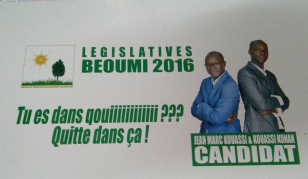 La campagne pour les élections législatives en Côte d’Ivoire bat son plein et chacun y va de son latin. En attendant le vote du 18 décembre 2016, les affiches de campagne trônent fièrement sur les pancartes au bord des routes. Au premier regard on est pris par un fou rire qui ne dit pas son nom. C’est quoi ces slogans ? A quoi ont-ils pensé ?